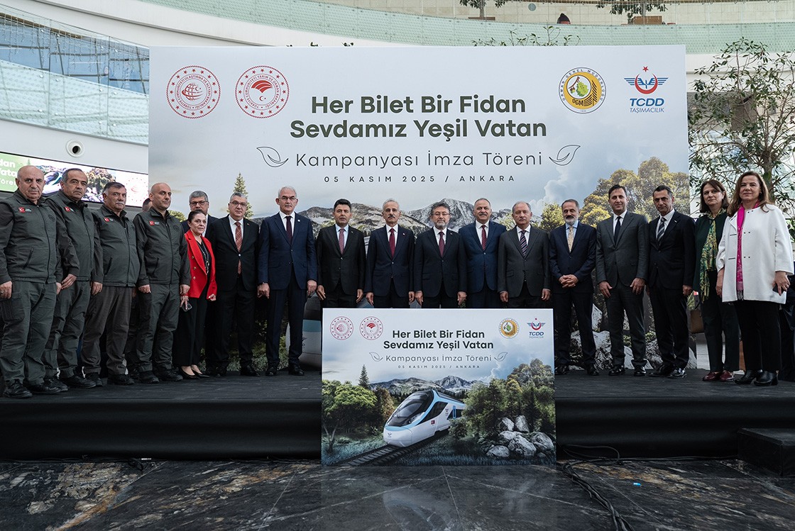 Tarım ve Orman ile Ulaştırma ve Altyapı bakanlıkları arasındaki "Her Bilet Bir Fidan Sevdamız Yeşil Vatan Ağaçlandırma İşbirliği Protokolü"nün imza töreni, Ankara Yüksek Hızlı Tren Garı'nda yapıldı.